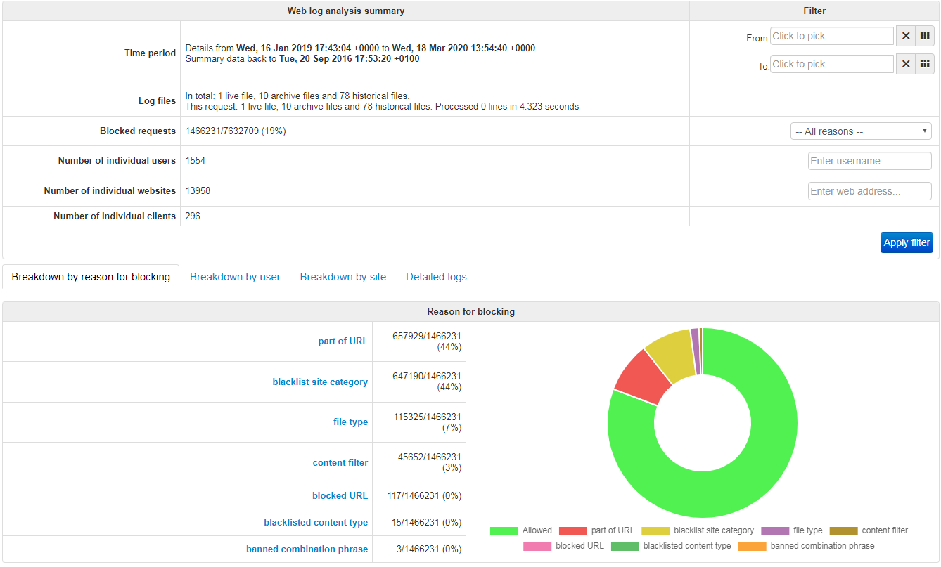 NetManager can intercept web traffic and force it via the web-filtering even if your devices are not set to use a proxy. This is particularly relevant for BYOD. For instance, it is possible to seamlessly block social media and ensure that all other access is logged for pupils' devices. There is also the option to decrypt secure web access (HTTPS interception and decryption) allowing you to log all search engine queries or block only part of a secure website.Analysis and reporting